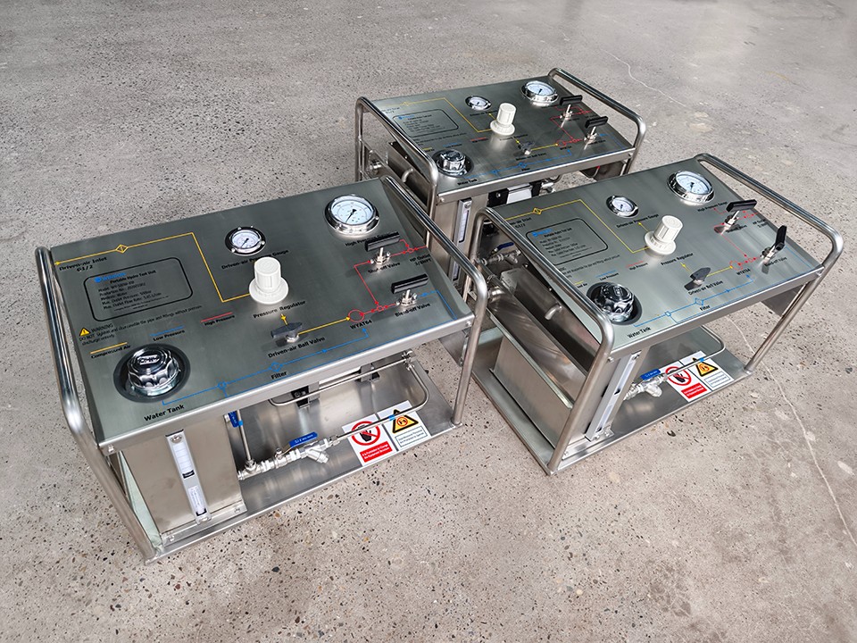 本设备属于工业专用试压装置,主要应用于管道、管件、压力容器等各类工业系统的水压试压检测工作。其工作原理为:以压缩空气为动力驱动液压活塞,通过活塞运动产生高压流体。该设备的核心优势体现在,无需配置复杂的电气系统与大功率电机,即可保障试压作业的安全性、高效性与经济性。